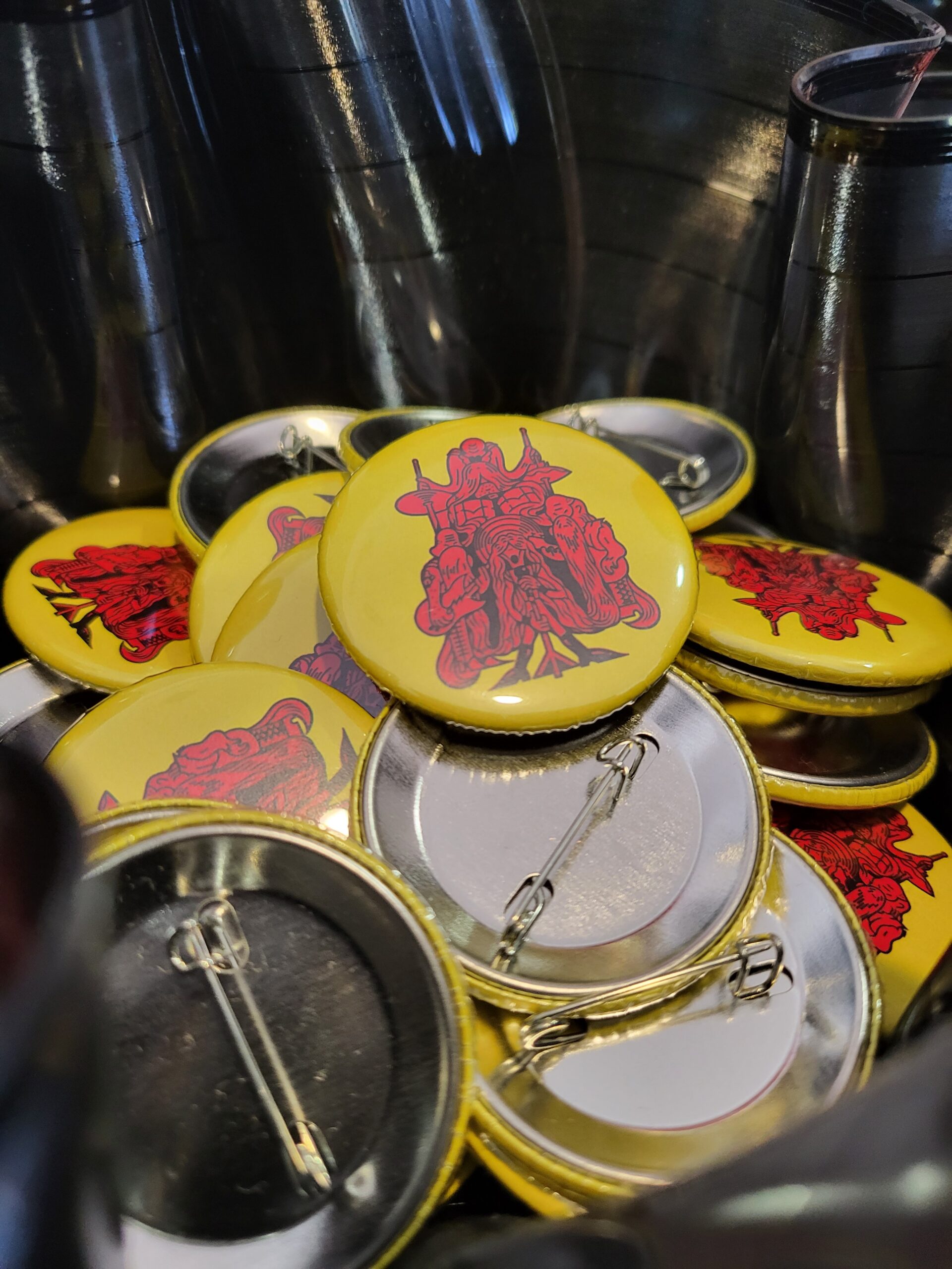 Badge z rumenim ali rdečim simbolom razstave ROCK POSTOJNA.