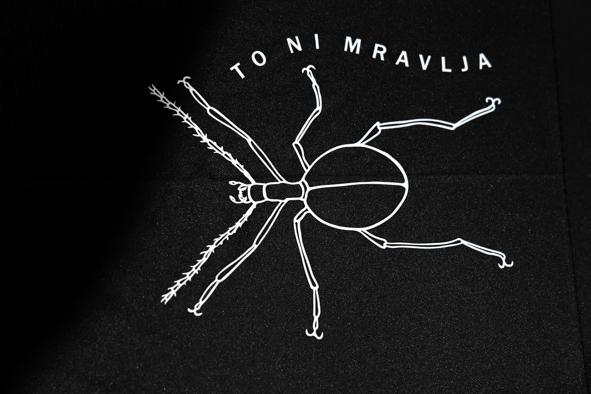 Na dežniku tako ni podoba mravlje, ampak jamskega hrošča Drobnovratnika.