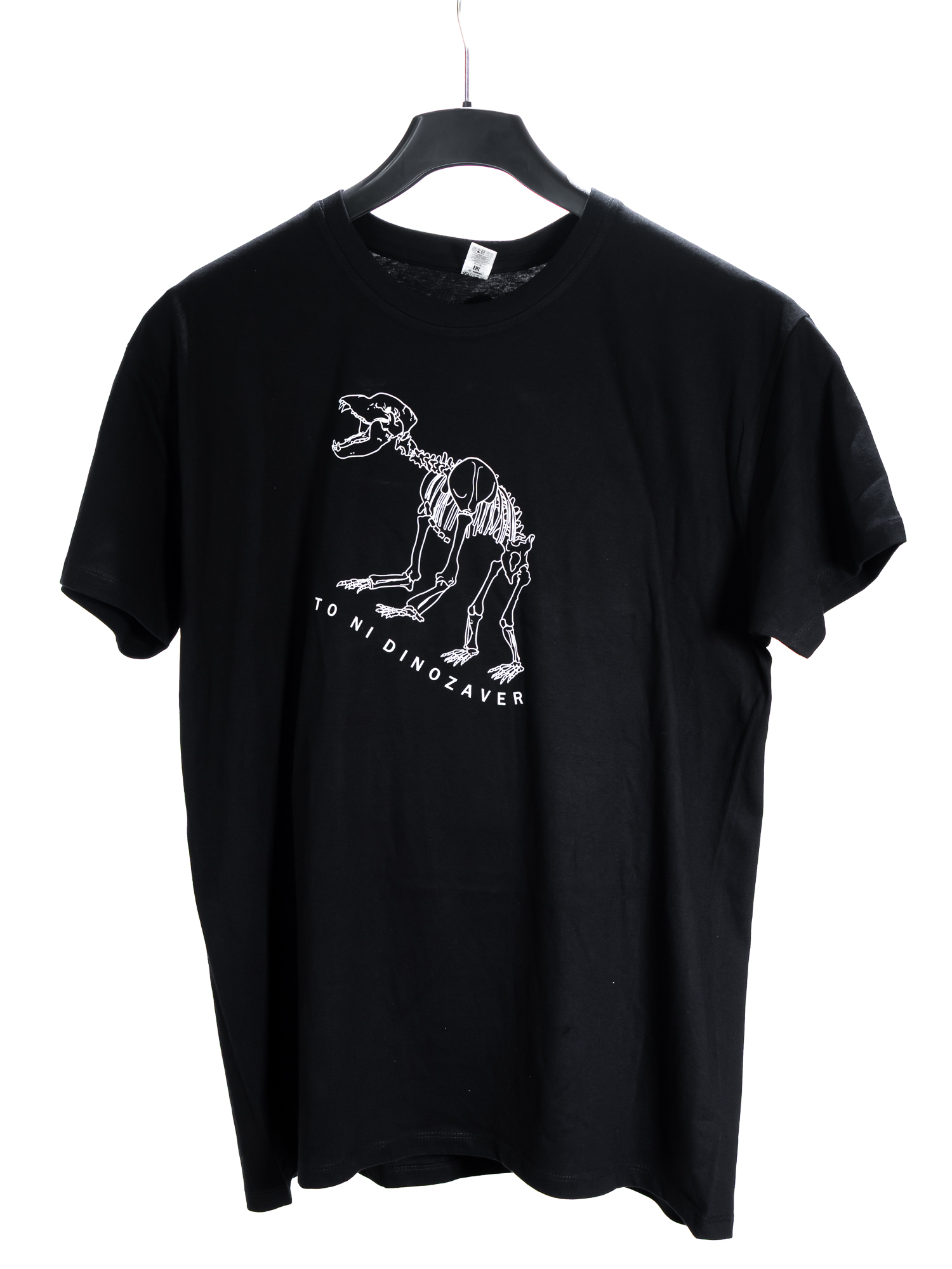 Majica je del kolekcije “TO NI,” s katero želimo v muzeju na šaljiv in zabaven način izobraževati naše obiskovalce in širiti muzealske resnice. Podoba na majici tako ni podoba dinozavra, ampak podoba okostja jamskega medveda, ki krasi recepcijo Notranjskega muzeja Postojna.