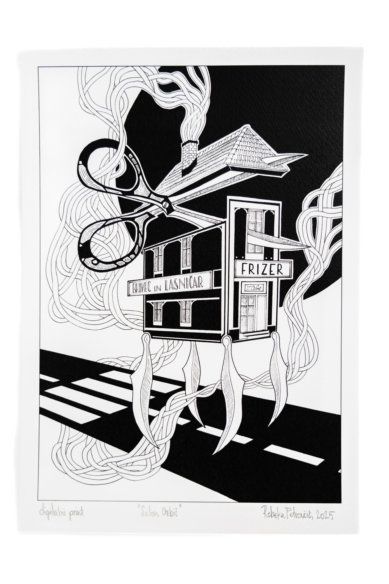 Print risbe z naslovom Brivnica Ozbič, avtorice Rebeke Petrovčič (ReLuna).