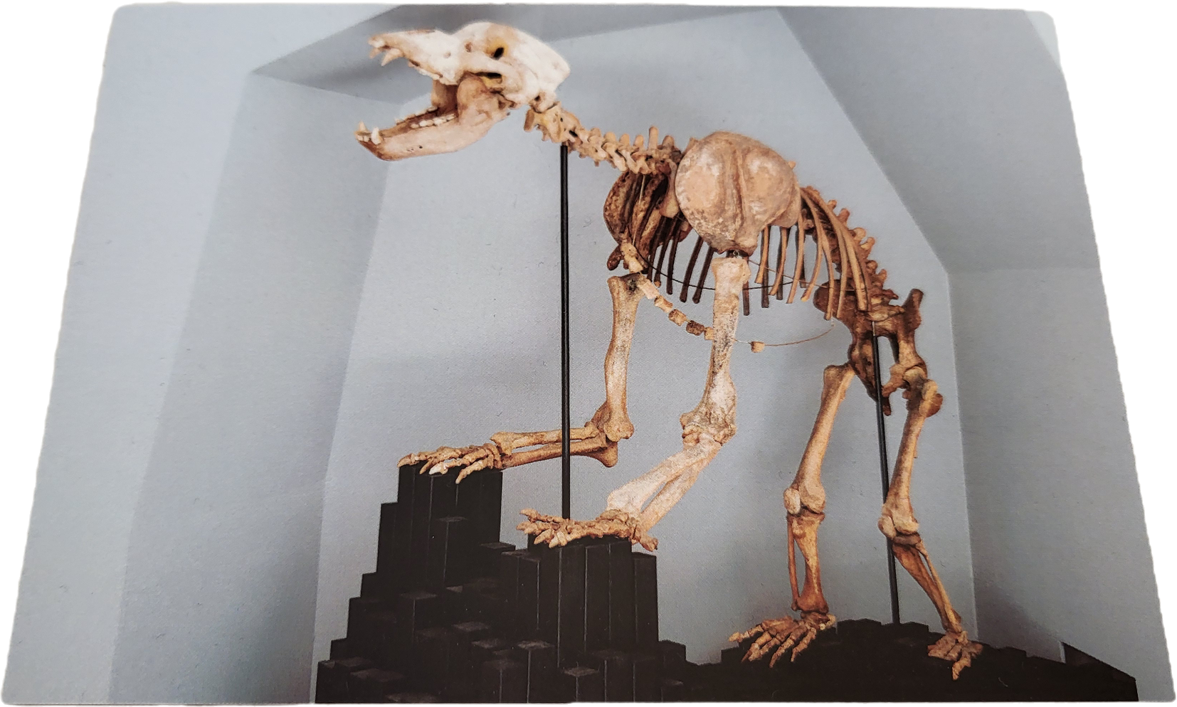 Razglednica okostja jamskega medveda (Ursus spelaeus), ki krasi recepcijo Notranjskega muzeja Postojna. Jamski medved je bil najznačilnejša živalska vrsta obdobja mlajšega pleistocena v Sloveniji. Pojavil se je v predzadnji ledeni dobi (pred približno 200.000 leti) in je izumrl pred približno 20.000 leti.