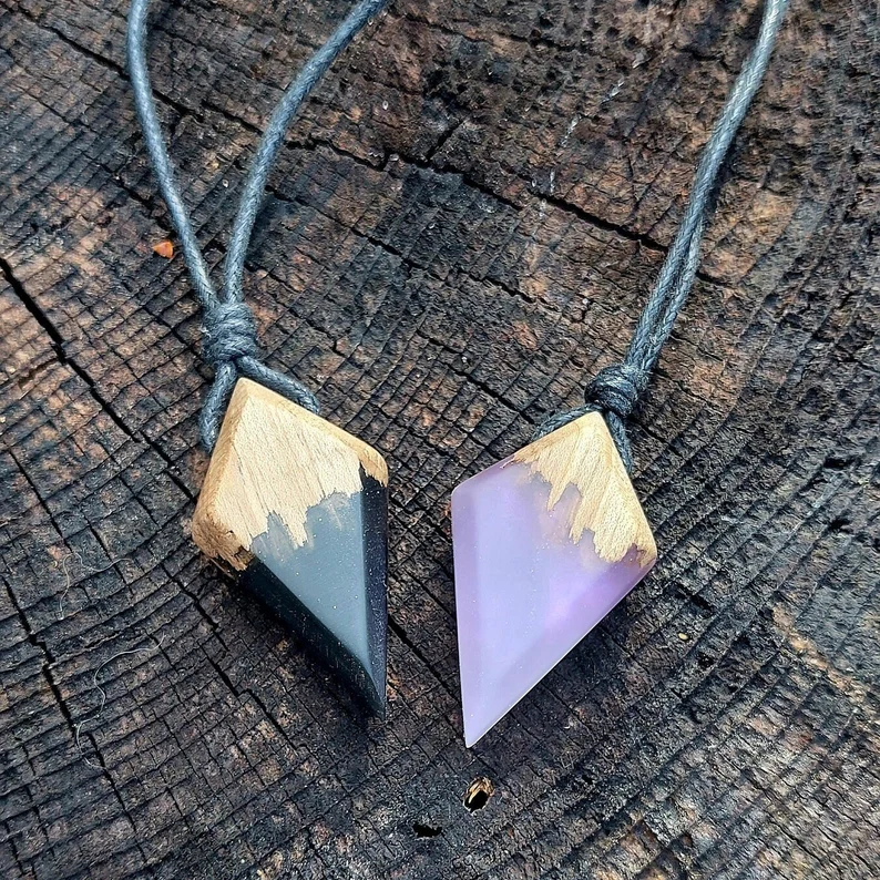 Obeski so ustvarjeni iz skrbno izbranih kosov lokalnega in tropskega lesa – oreha, slive, ebenovine, mahagonija in korine. V kombinaciji z epoksidno smolo živih barv nastane preplet naravnih struktur in barvnih odsevov, ki ujamejo svetlobo na edinstven način.